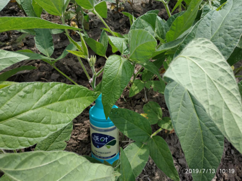 a、苗期:大豆出齊苗后,沃葉含氨基酸水溶性肥料1000倍液噴施,促進根系生長,苗壯。株高20公分左右,沃葉含氨基酸水溶肥料1200倍液+沃葉磷酸二氫鉀1000倍液噴施。葉片肥厚寬大,葉片深綠有光澤。